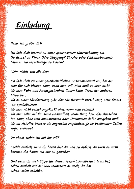 da möchte man mal jemanden zum erstenmal in die Sauna einladen und weiß nicht, wie man es sagen soll, um nicht gleich mit dem Wort "Sauna" einen negativen Eindruck hervorzurufen.