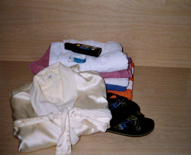 3. Badeanzug/Badehose - wenn man auch mal in das "normale" Schwimmbad will, so fern die Saunaanlage einem Halle- oder Spaßbad u.ä. angeschlossen ist. In manchen Anlagen, im Sommer an sehr heißen Tagen, im Gastronomiebereich statt Bademantel geduldet.